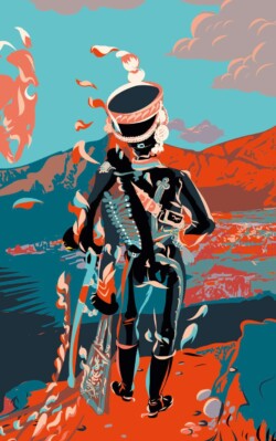 Este canto es una fantasía compuesta a partir de dos personajes históricos chilenos: José Miguel Carrera Verdugo y Bernardo O’Higgins Riquelme, El Húsar y el General. Aquí asistimos, por medio de las imágenes de este libro ilustrado, a un viaje espiritual de estos dos próceres al infierno, a sus propios mundos interiores. Este es el tema base, el hilo conductor de esta obra gráfica. La Muerte, no tan solo como el final de la vida, sino como una segunda posibilidad para recomponer lo vivido, vengar las injusticias. Una segunda posibilidad para no perder ese instante. Todo esto acompañado por un texto escrito en la compleja tradición de las décimas, texto que construye una estructura sólida para sostener la fuerza de las ilustraciones.